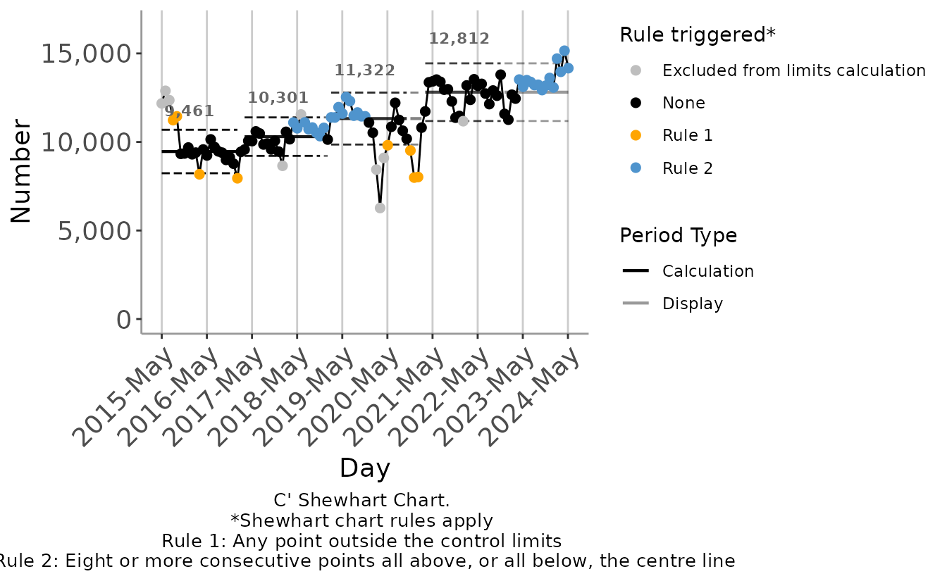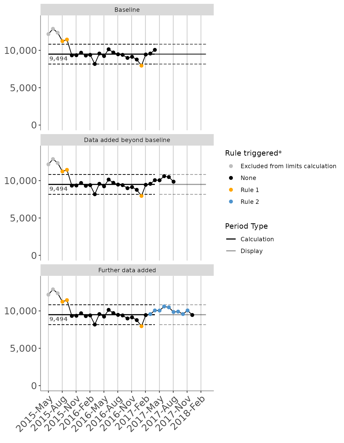 In other words, the SSA re-establishes limits at shift rule breaks, provided that the shift is not “transient” in some sense. Here “transient” means that once we calculate the new control limits, there is not a shift rule break back towards the original process. In the next two sections we make this idea precise and describe how it is operationalised in the SSA.